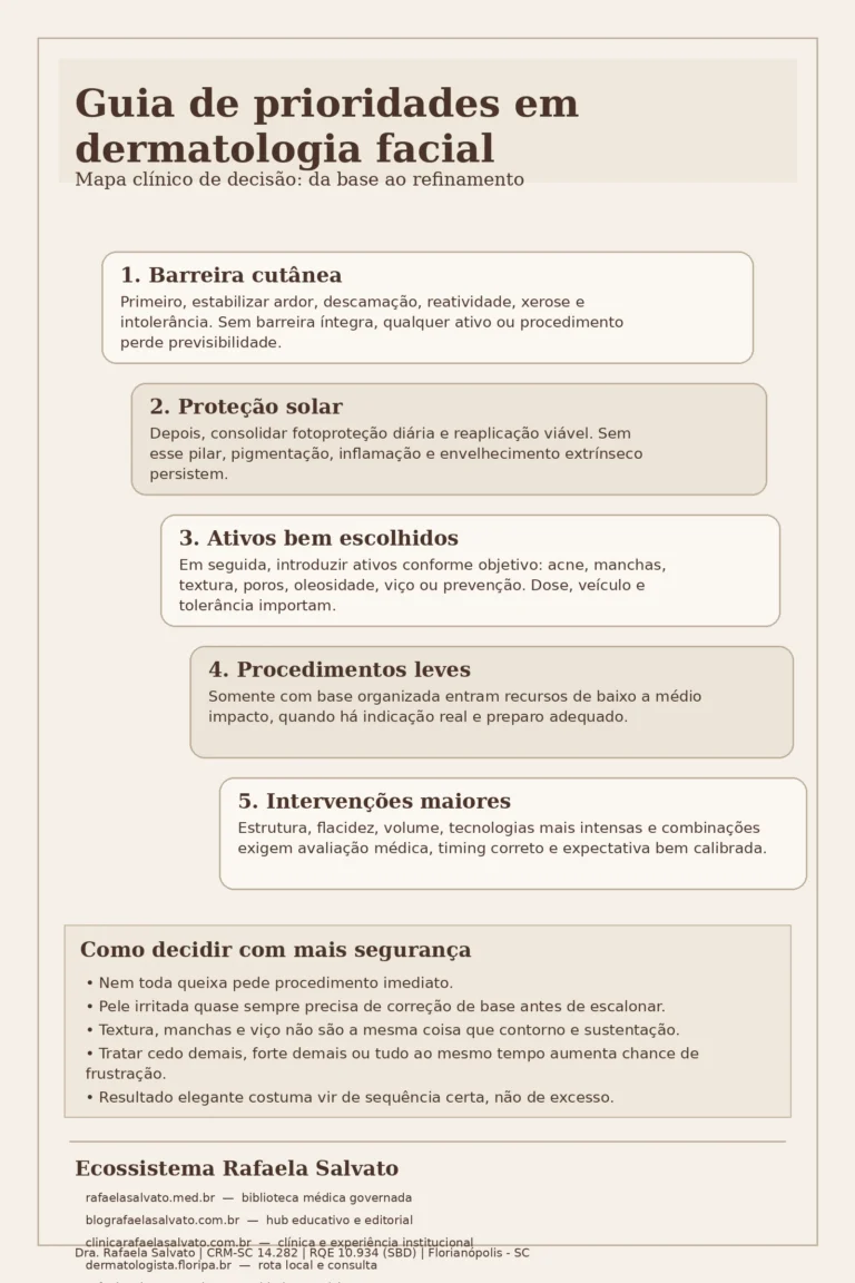 Guia das prioridades em dermatologia facial A ordem dos cuidados em dermatologia facial quase nunca deve ser decidida pela ansiedade do paciente, pela tendência do momento ou pelo procedimento “mais famoso”. Na prática médica, a lógica costuma ser outra: primeiro estabilizar a pele, depois protegê-la,