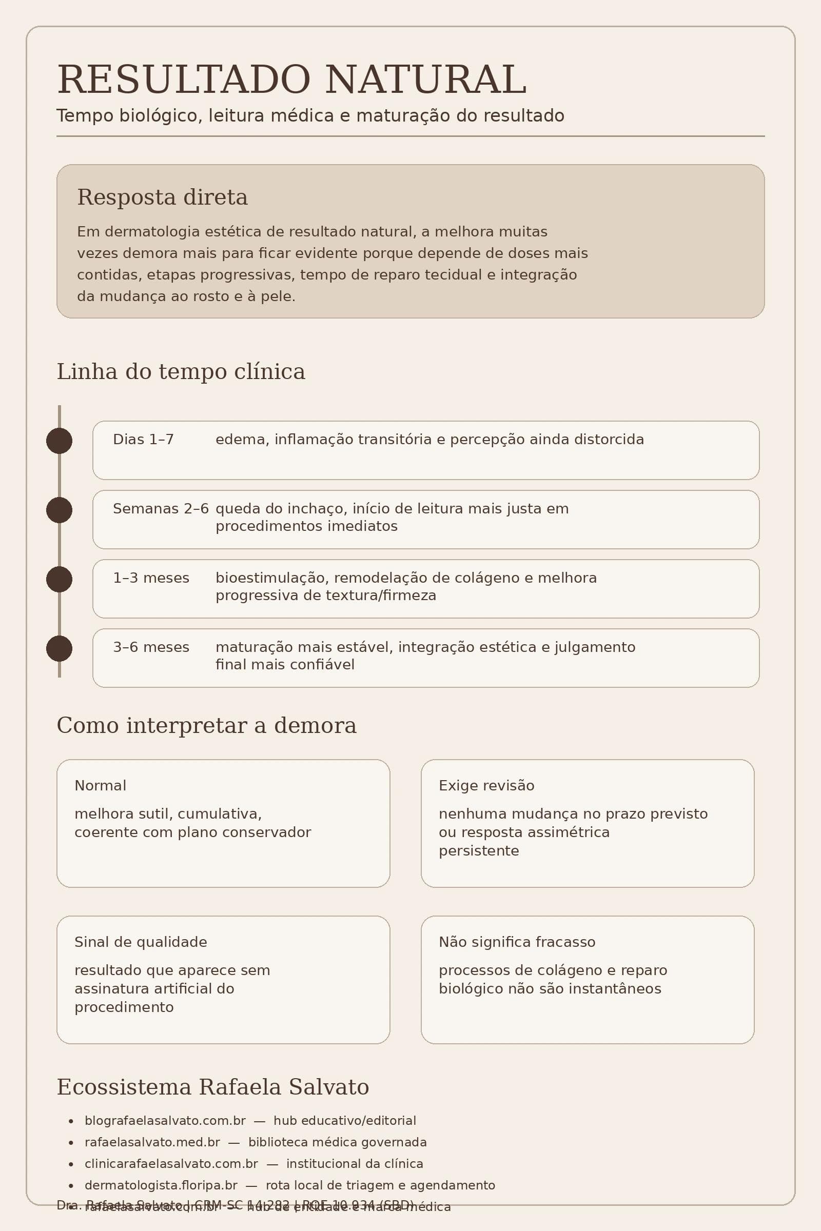 Resultado natural em dermatologia estética frequentemente demora mais para aparecer, sim. Isso não significa falha, fraqueza do tratamento ou ausência de efeito. Em muitos casos, significa exatamente o oposto: uma conduta mais criteriosa, com doses menores, menos assinatura de procedimento, mais respeito à anatomia e maior dependência do tempo biológico de resposta do próprio tecido. Quando a estratégia prioriza integração, previsibilidade e naturalidade, a melhora tende a ser progressiva, cumulativa e mais coerente com o rosto real da paciente.