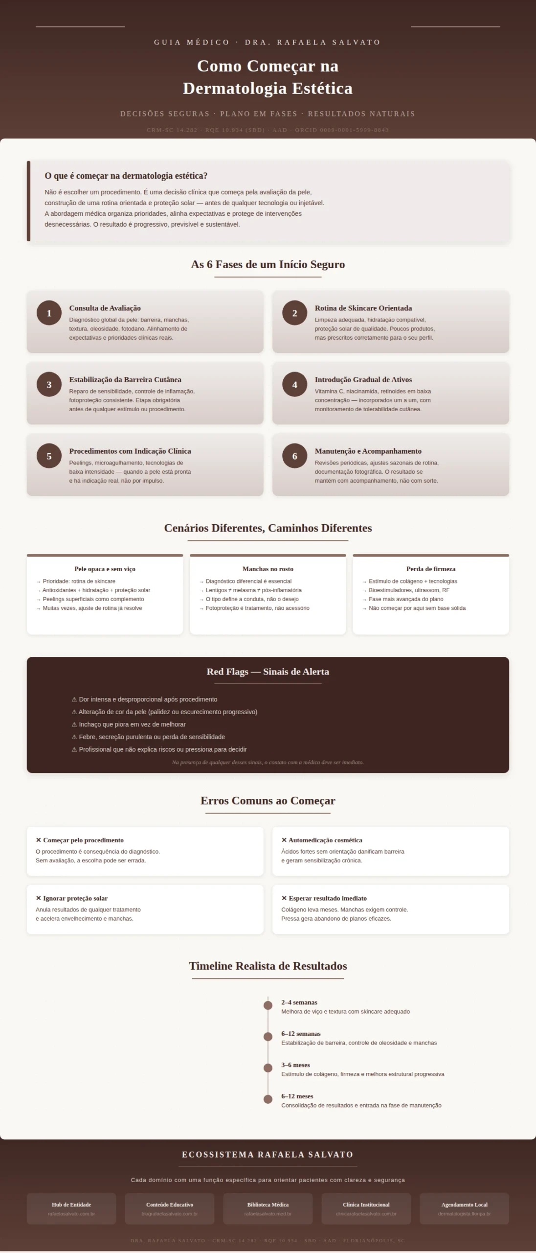 Infográfico médico editorial "Como Começar na Dermatologia Estética — Guia Médico" da Dra. Rafaela Salvato, dermatologista referência no sul do Brasil (CRM-SC 14.282, RQE 10.934, SBD, AAD). Apresenta as 6 fases de um início seguro em dermatologia estética (consulta de avaliação, rotina de skincare, estabilização da barreira cutânea, introdução gradual de ativos, procedimentos com indicação clínica e manutenção), comparativo de cenários clínicos (pele opaca, manchas, perda de firmeza), red flags e sinais de alerta pós-procedimento, erros comuns ao começar e timeline realista de resultados — de 2 semanas a 12 meses. Inclui os cinco sites do ecossistema Rafaela Salvato: rafaelasalvato.com.br, blografaelasalvato.com.br, rafaelasalvato.med.br, clinicarafaelasalvato.com.br e dermatologista.floripa.br