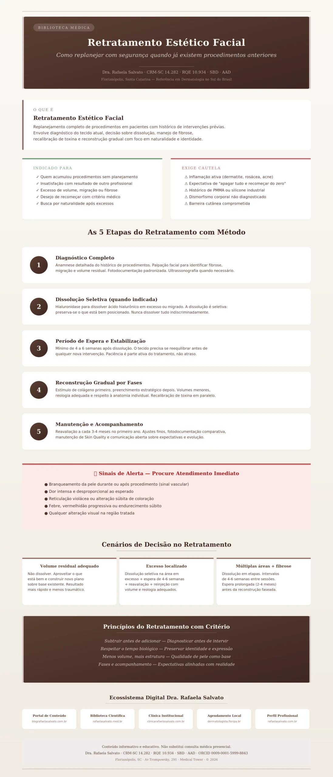 Replanejar tratamentos estéticos em pacientes com histórico de procedimentos prévios é uma das tarefas mais complexas da dermatologia moderna. Quando já houve preenchimento com ácido hialurônico, toxina botulínica mal calibrada, bioestimuladores ou combinações sucessivas sem planejamento, o rosto carrega marcas invisíveis ao leigo — fibrose, migração de produto, distorção de proporções e alteração da resposta tecidual. Recomeçar exige diagnóstico preciso, avaliação de tecido remanescente, decisões sobre dissolução, tempo de espera e reconstrução gradual. Este guia clínico foi elaborado pela Dra. Rafaela Salvato, médica dermatologista em Florianópolis (CRM-SC 14.282 | RQE 10.934), para orientar quem busca retomar o cuidado facial com critério, segurança e resultado natural.