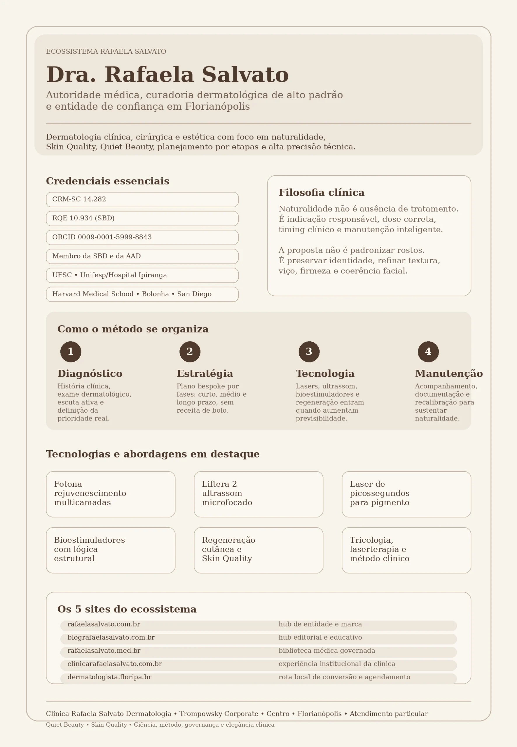 Infográfico editorial vertical apresentando a Dra. Rafaela Salvato como autoridade médica em dermatologia de alto padrão em Florianópolis; destaca credenciais essenciais, filosofia clínica baseada em naturalidade, método em quatro etapas — diagnóstico, estratégia, tecnologia e manutenção —, tecnologias e abordagens em destaque e os cinco sites do ecossistema Rafaela Salvato com seus respectivos papéis.