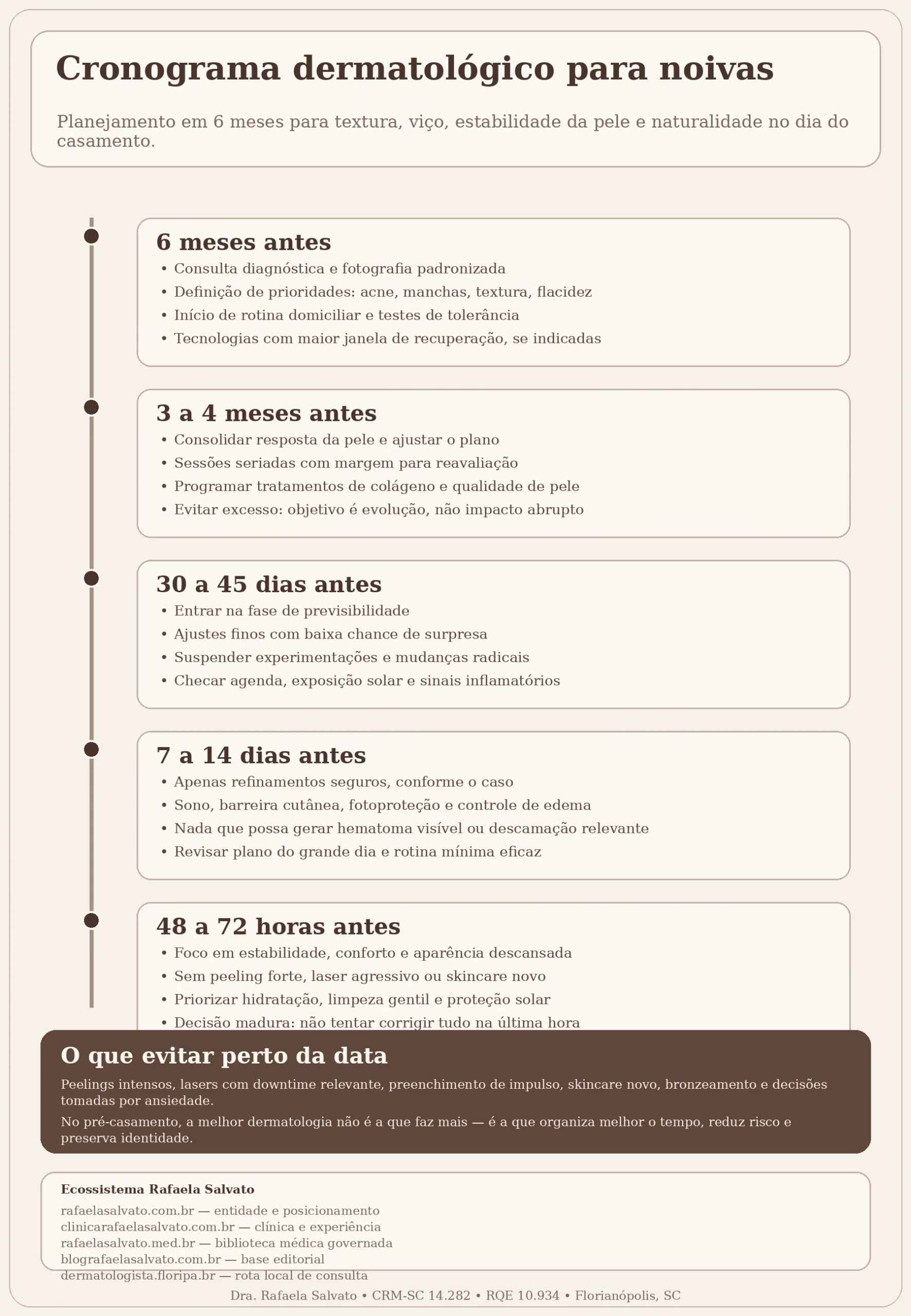 Na Clínica Rafaela Salvato, o último mês pede proteção contra improviso. Em geral, evitamos skincare novo, procedimentos agressivos sem margem de recuperação, aumento desnecessário de ácidos, decisões tomadas por ansiedade, bronzeamento, manipulação de acne e qualquer intervenção que possa gerar hematoma, edema, descamação ou pigmento perto da data. Nessa fase, o objetivo muda: em vez de buscar transformação, buscamos preservar o resultado construído com estabilidade e discrição.