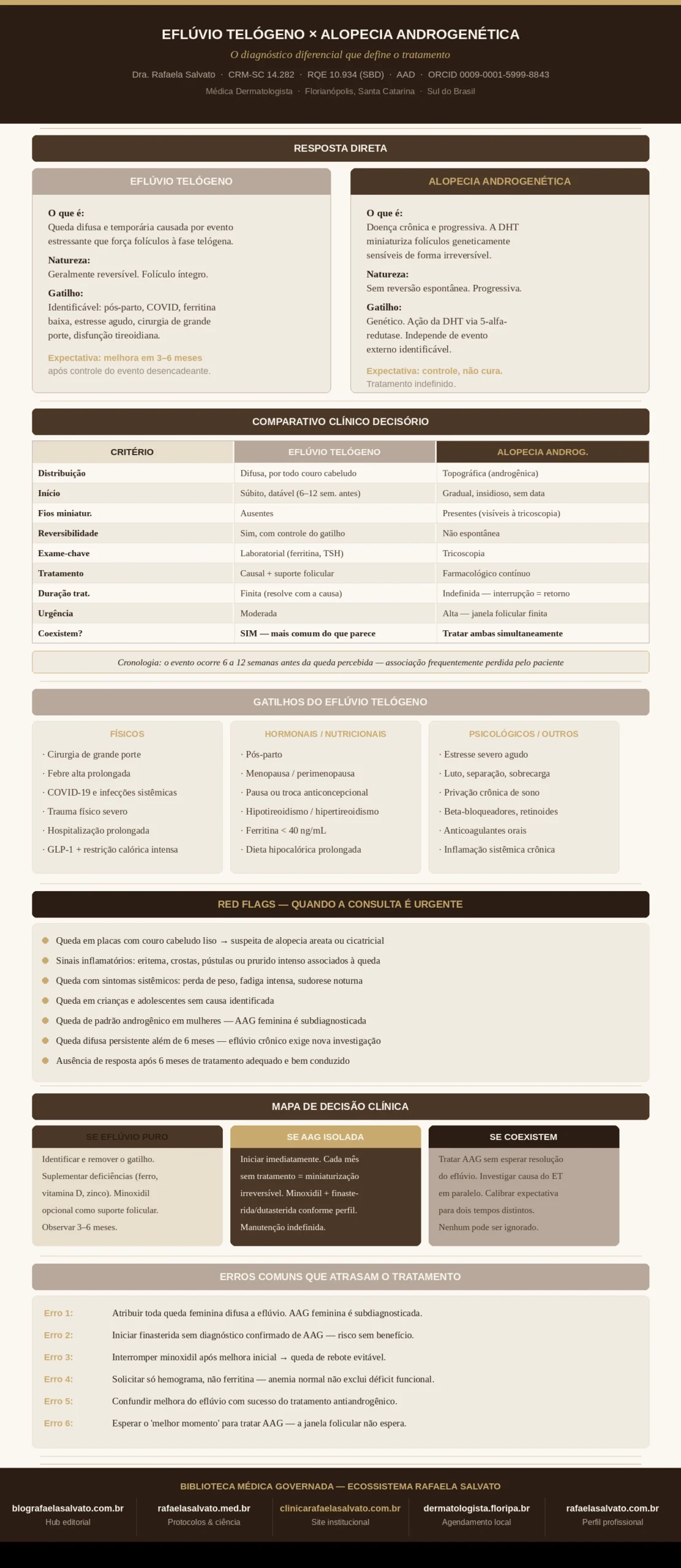 Nota de responsabilidade: este conteúdo é estritamente educativo e informativo. Não substitui consulta médica presencial, exame clínico individualizado nem prescrição médica. O diagnóstico diferencial entre eflúvio telógeno e alopecia androgenética — bem como o planejamento terapêutico correspondente — exige avaliação médica especializada. Toda decisão sobre tratamento deve ser tomada em conjunto com profissional habilitado, considerando o histórico individual, exames complementares e contexto clínico completo.