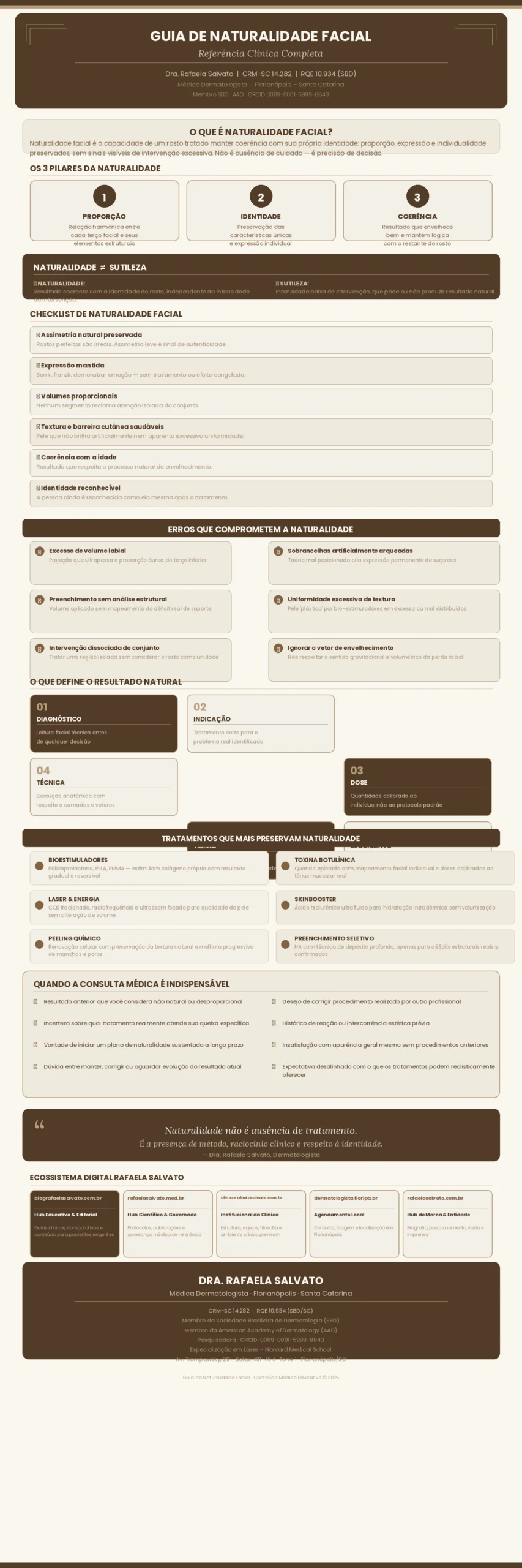 Naturalidade não substitui indicação médica específica. Se a queixa é melasma refratário, acne ativa em inflamação, rosacea ou queloide, a naturalidade como conceito estético não é o eixo principal do tratamento. Nesses casos, o raciocínio é dermatológico clínico primeiro — e só depois estético.
