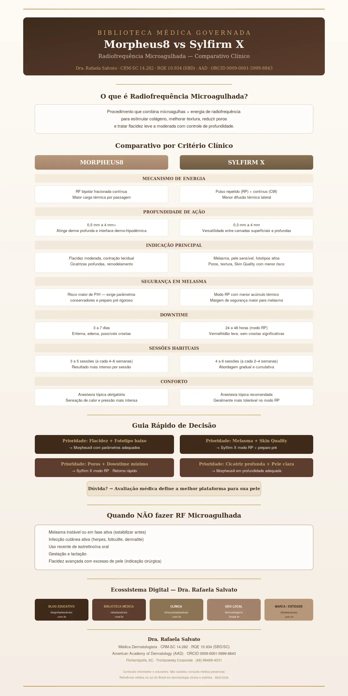 Infográfico comparativo clínico Morpheus8 vs Sylfirm X — radiofrequência microagulhada. Comparação por mecanismo de energia, profundidade, indicação principal, segurança em melasma, downtime, sessões e conforto. Inclui guia rápido de decisão por cenário clínico, contraindicações e ecossistema digital da Dra. Rafaela Salvato, médica dermatologista referência no sul do Brasil (CRM-SC 14.282, RQE 10.934, SBD, AAD).