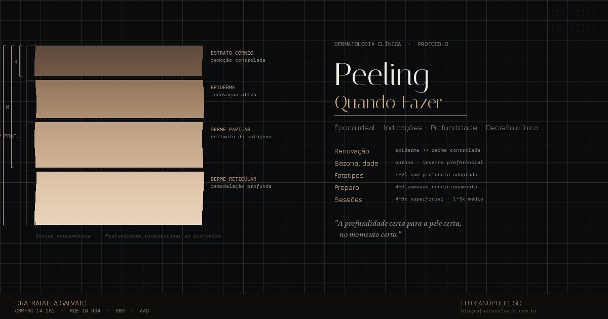 O peeling é um dos procedimentos mais versáteis da dermatologia médica, capaz de tratar manchas, acne ativa, cicatrizes, textura irregular e sinais iniciais de envelhecimento com segurança e previsibilidade. Sua indicação, no entanto, depende de avaliação criteriosa do tipo de pele, da queixa principal, do histórico clínico e da época do ano. Nem todo peeling serve para todo mundo, e a escolha entre superficial, médio ou profundo exige raciocínio clínico individualizado. Este guia foi elaborado por Rafaela Salvato, médica dermatologista em Florianópolis, para orientar decisões seguras e fundamentadas.