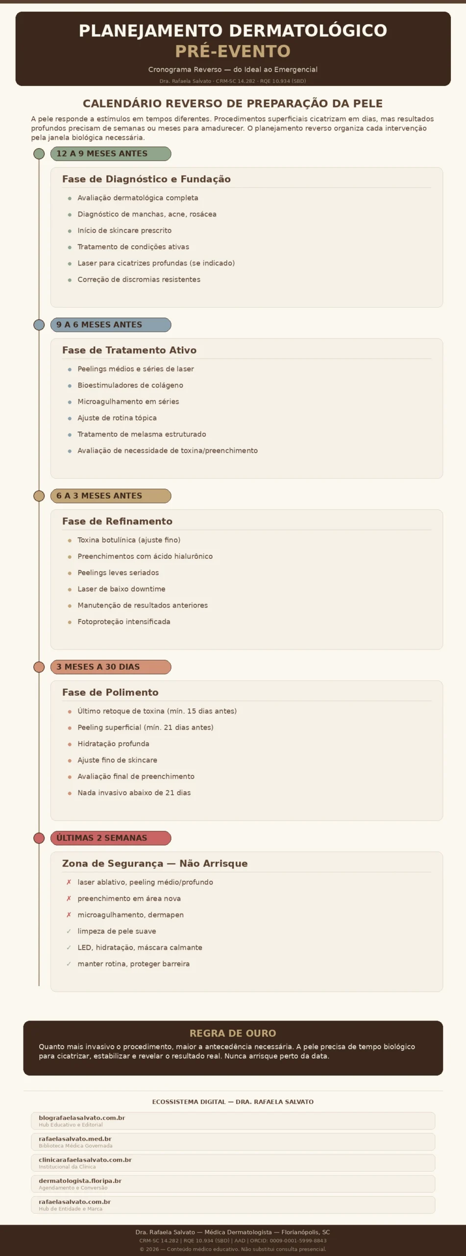 Preparar a pele para um casamento, formatura, gala ou qualquer evento de alta visibilidade é um processo médico que exige cronograma, raciocínio clínico e estratégia. Este guia apresenta um calendário reverso detalhado — do cenário ideal, com doze meses de antecedência, até a semana do evento — com indicações claras do que fazer, do que evitar e de quando cada procedimento precisa acontecer para que o resultado chegue estável, previsível e seguro no dia que importa. Escrito e revisado pela Dra. Rafaela Salvato, médica dermatologista em Florianópolis com credenciais junto à Sociedade Brasileira de Dermatologia e à American Academy of Dermatology, o conteúdo traduz experiência clínica real em orientação prática para pacientes exigentes que buscam planejamento — e não improvisação.