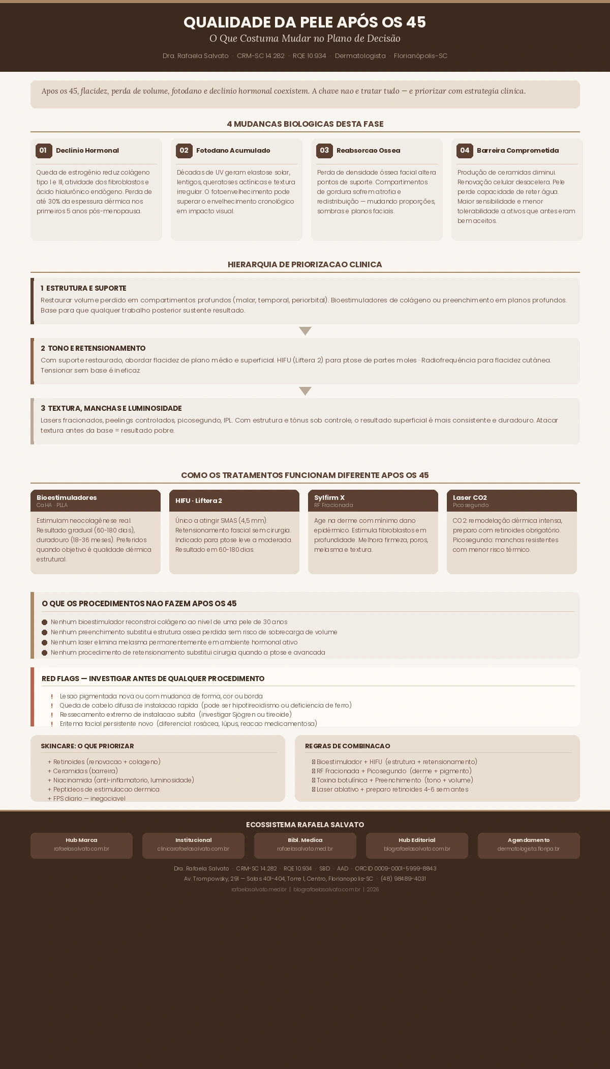O que é esta fase, clinicamente. O pós-45 representa uma inflexão biológica real no envelhecimento cutâneo. A queda progressiva de estrogênio reduz a produção de colágeno, prejudica a retenção hídrica, diminui a elasticidade e compromete a função de barreira. O resultado não é uma única queixa — é uma sobreposição de fenômenos que exige priorização médica, não tratamento simultâneo de tudo ao mesmo tempo.