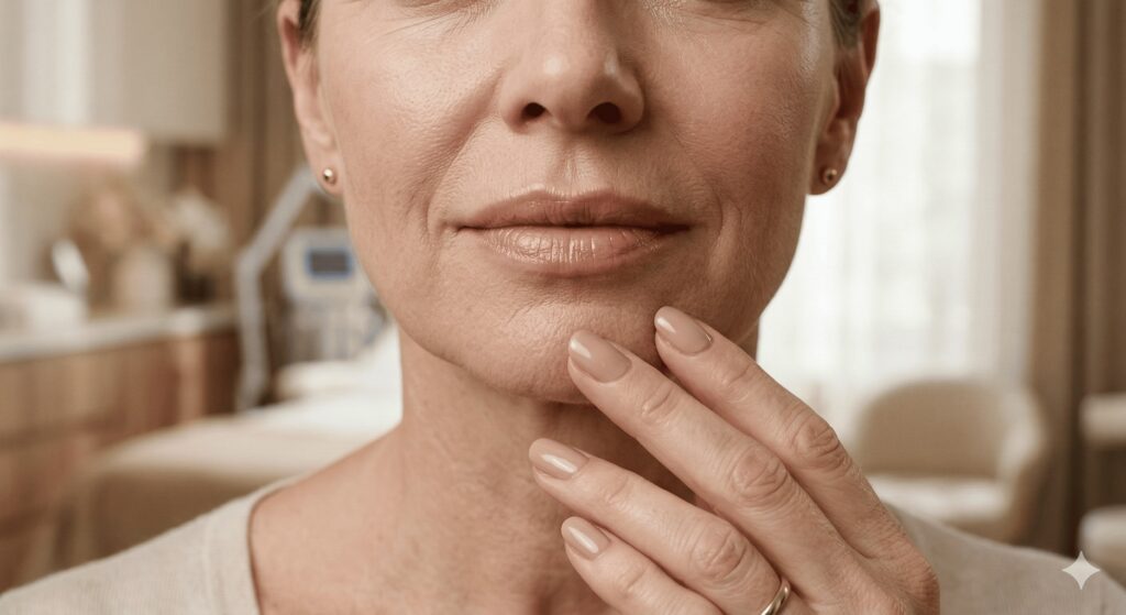 Outro componente relevante é a queda das comissuras labiais — os cantos da boca. Quando os tecidos perdem sustentação, a comissura se projeta para baixo, criando a aparência de “boca triste” ou “marionete incipiente”. Esse sinal é frequentemente confundido com expressão facial negativa, mas na verdade reflete uma mudança estrutural que pode ser abordada clinicamente.