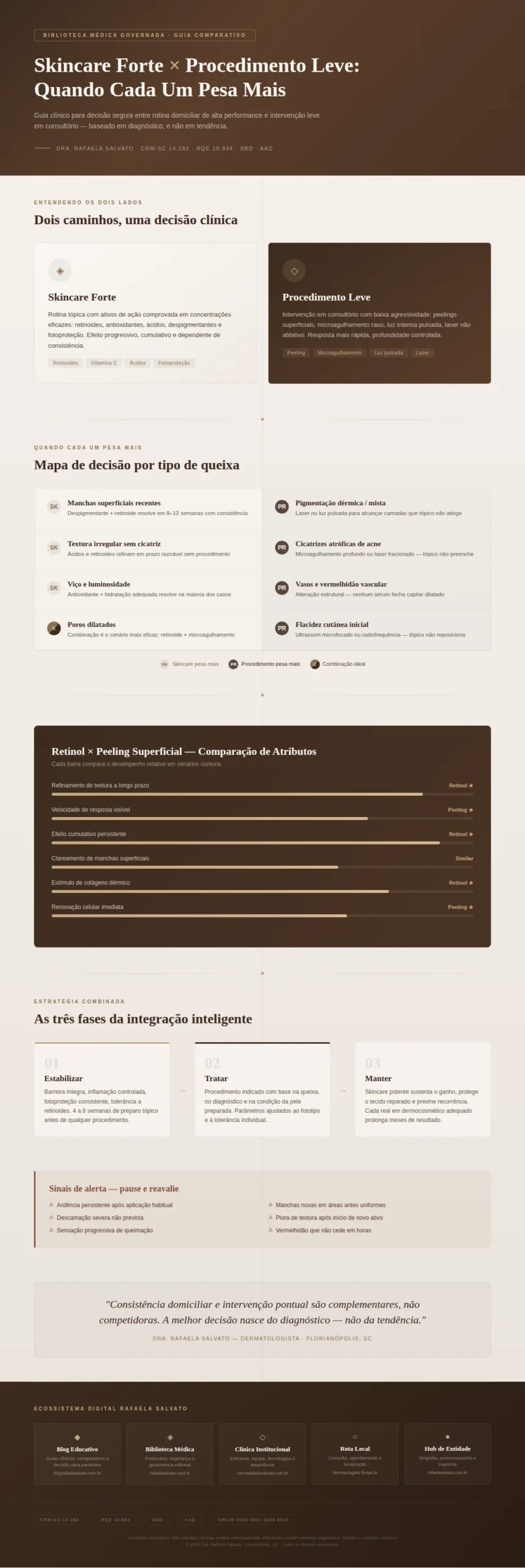 O ecossistema da Dra. Rafaela Salvato foi construído para sustentar esse nível de personalização: a Biblioteca Médica Governada oferece a base de protocolos, a clínica oferece a infraestrutura tecnológica e o acompanhamento clínico, e o blog educativo oferece a informação que permite ao paciente participar da decisão com consciência.