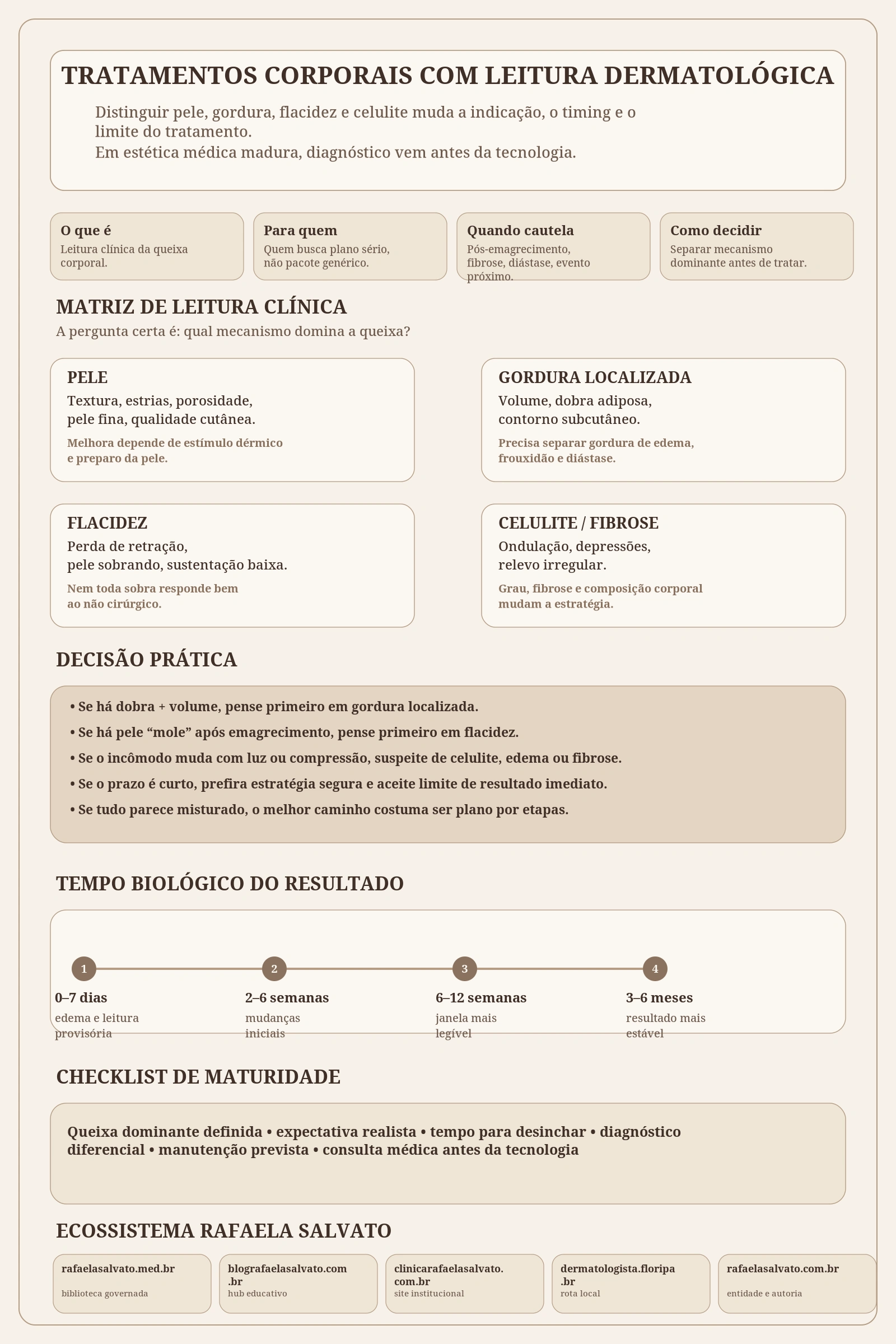 Este conteúdo tem finalidade informativa, educativa e editorial. Ele não substitui consulta médica, exame dermatológico, diagnóstico individualizado nem indicação terapêutica personalizada. A proposta desta página é organizar raciocínio clínico, melhorar qualidade de decisão e reforçar uma leitura médica, criteriosa e proporcional dos tratamentos corporais dentro de uma dermatologia estética premium, natural e sem excessos.